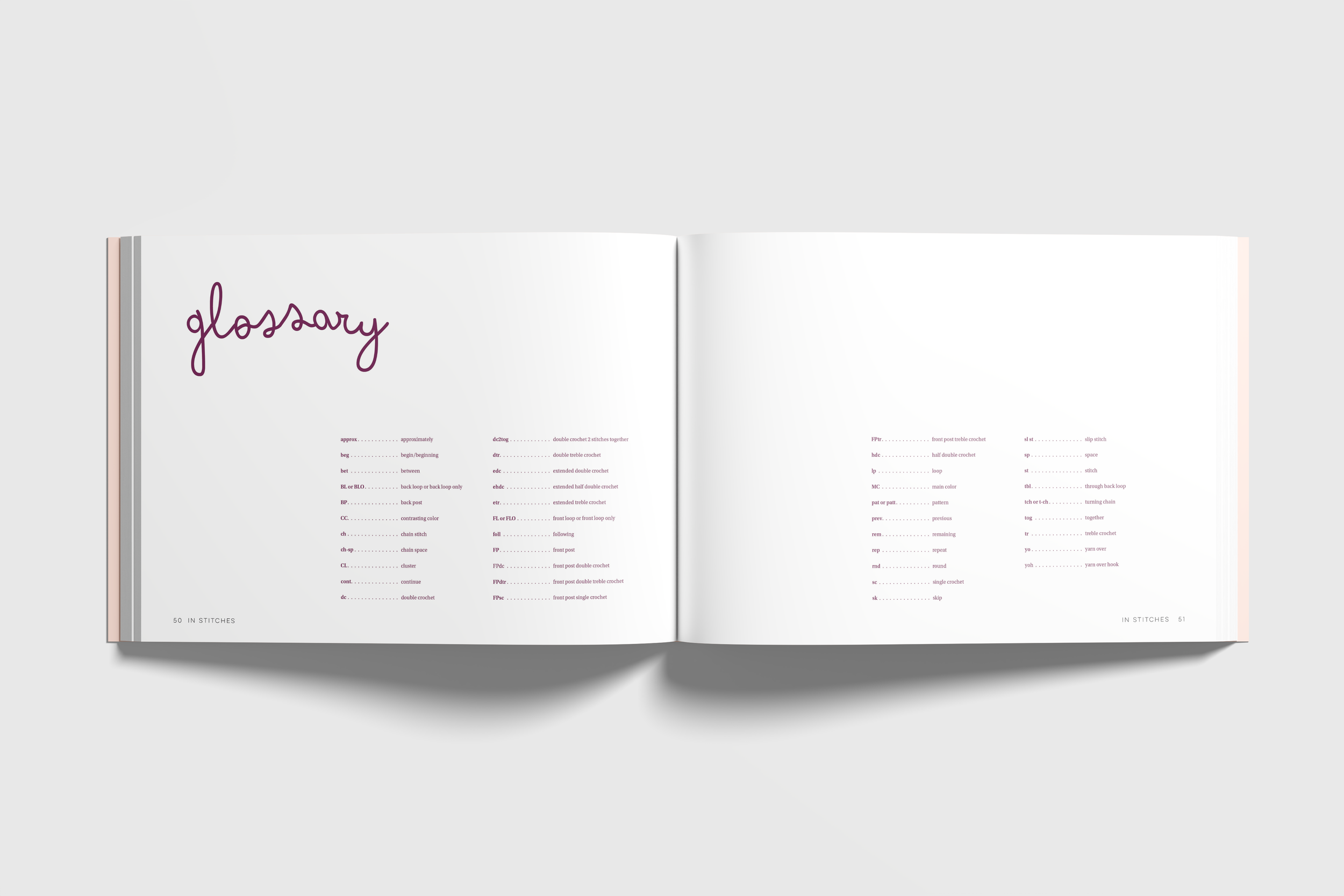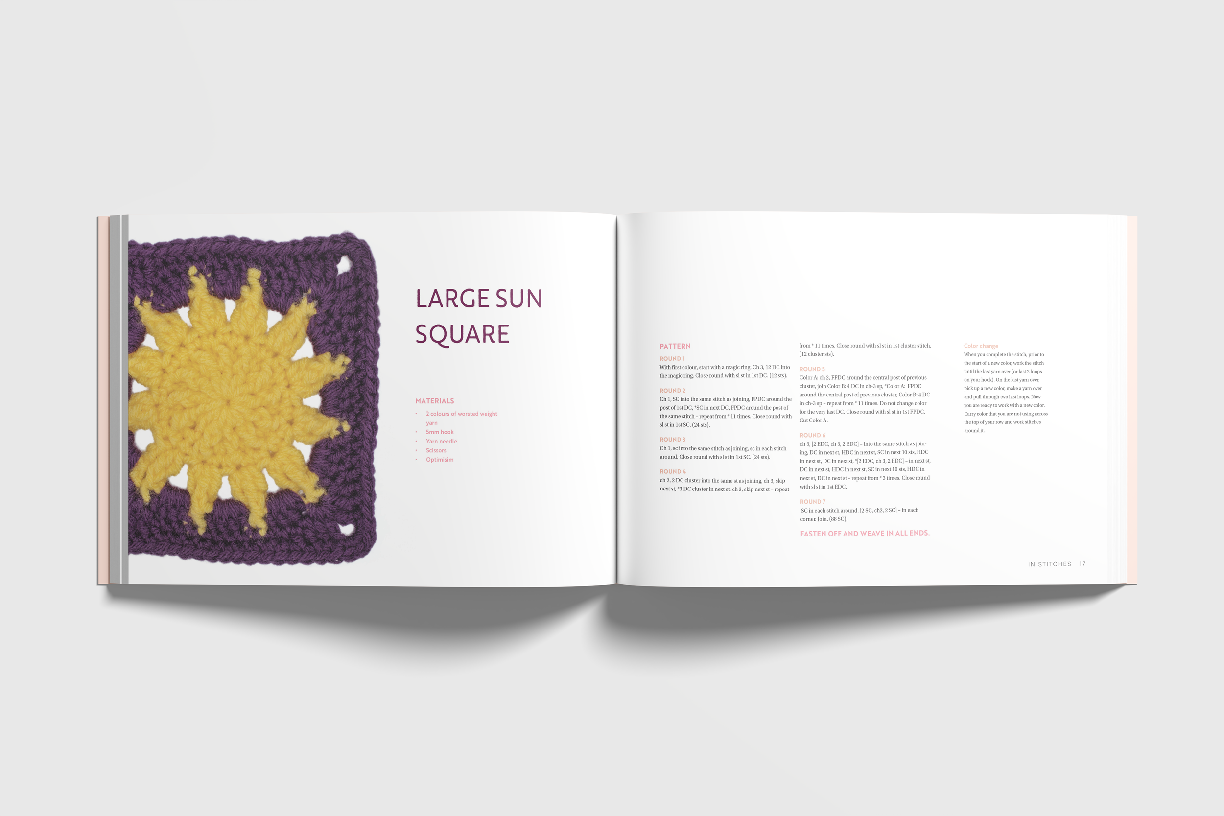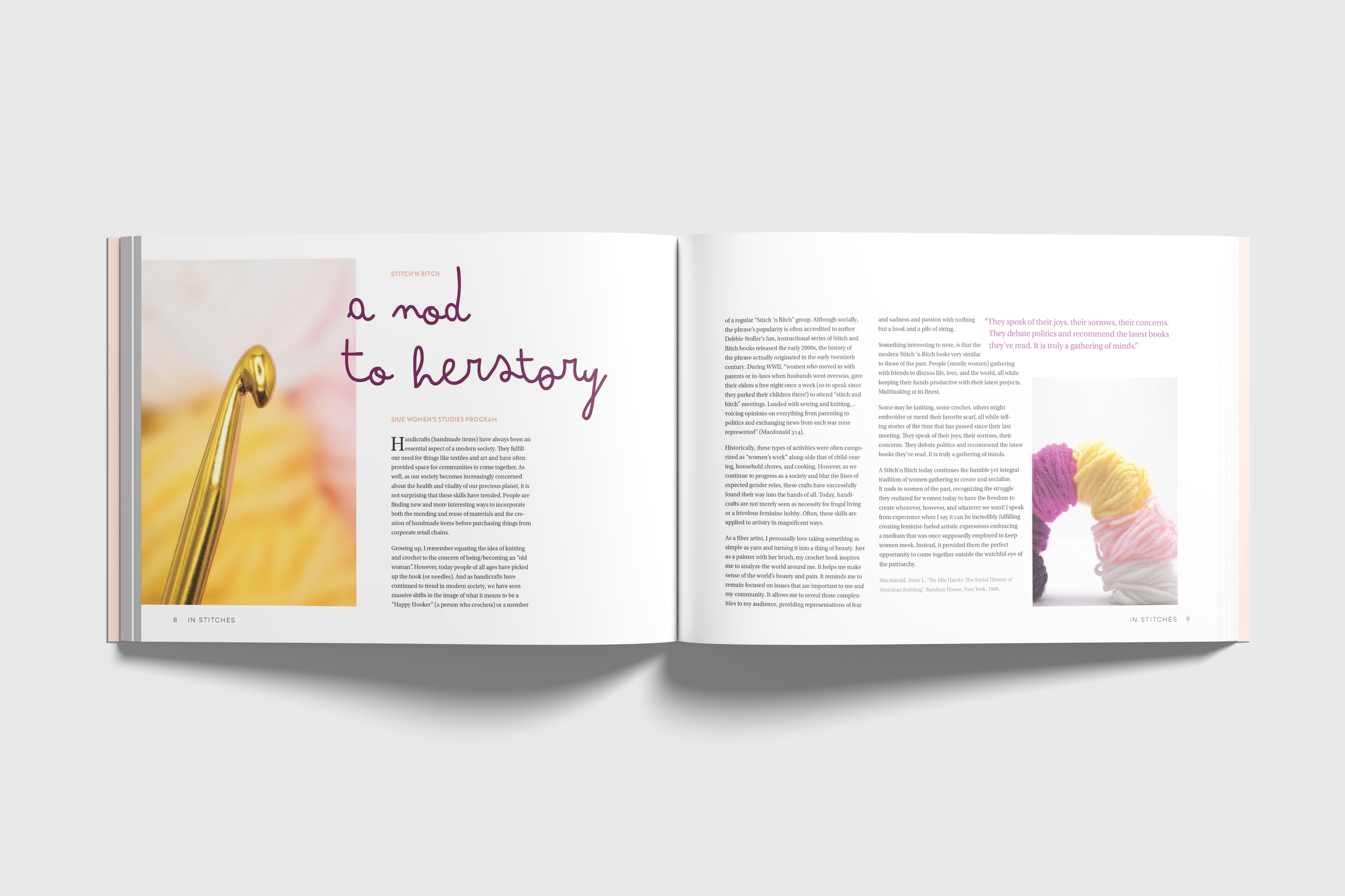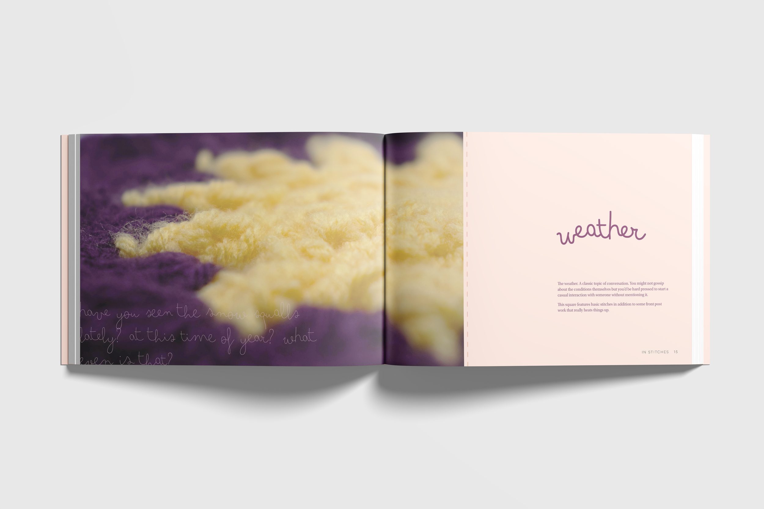 In Stitches is a coffee-table style book that pairs crochet squares with topics of conversation, relating to the social experience of Stitch’n’Bitch textile groups and commenting on the importance of community.